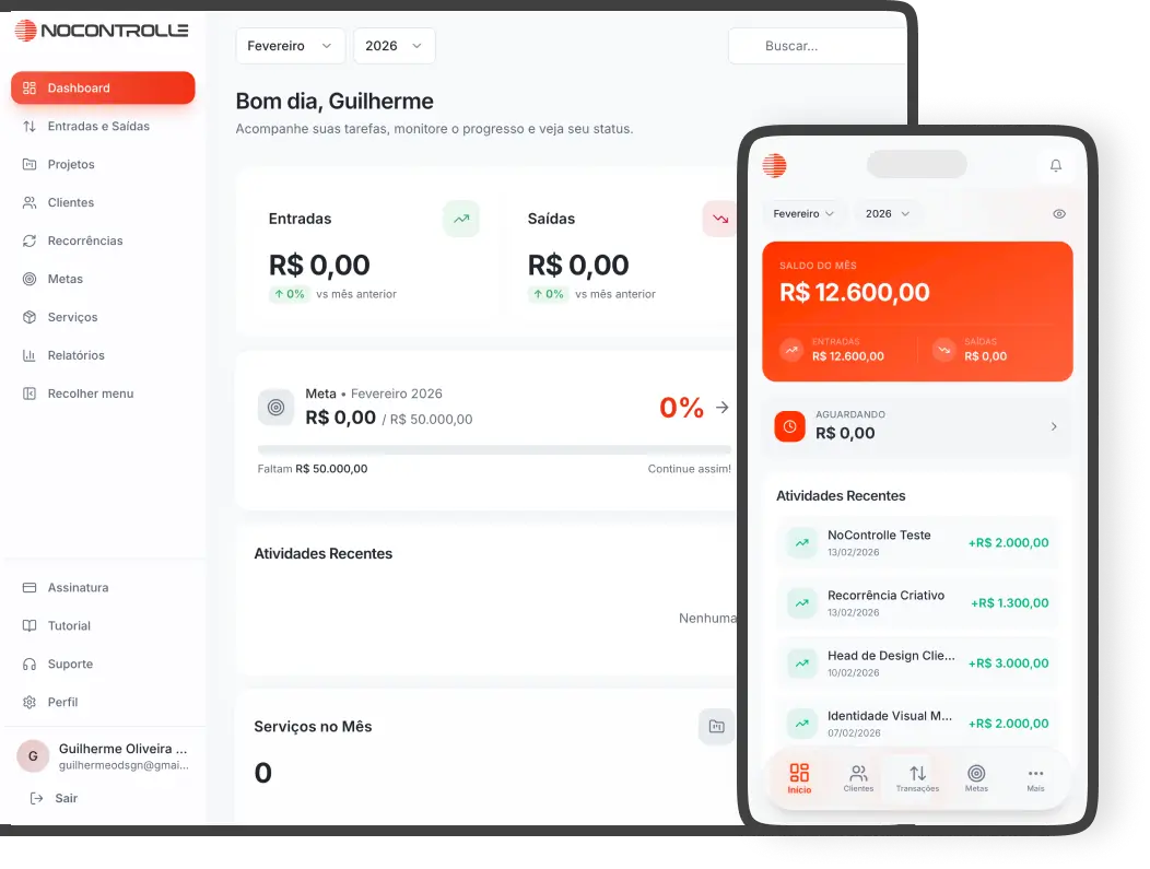 Na NoControlle, você organiza as finanças, serviços, clientes, recorrências, metas e toda parte Financeira da sua empresa em um único lugar.